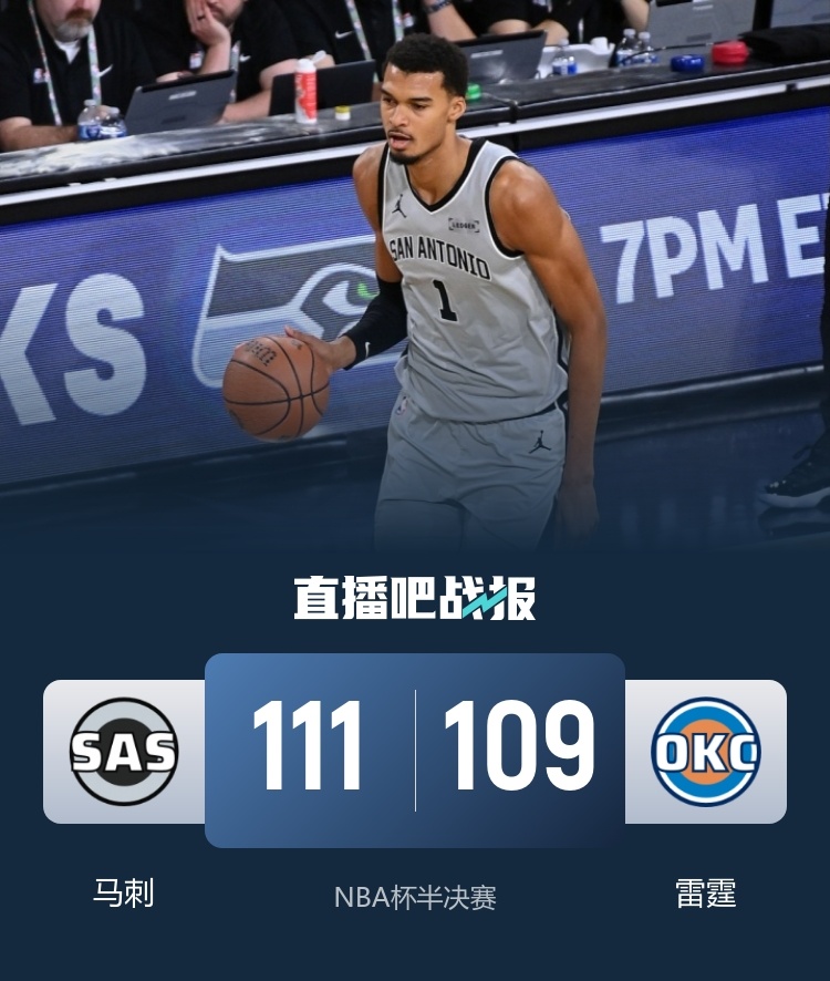 首节对决雷霆延续近期爆表状态上来就是一波22-10的攻势直接拉开两位数优势;马刺外线迟迟打不开前12次三分出手全部打铁,不过进入轮换后马刺逐渐找到感觉,文班亚马次节登场迎来复出并带队送出9-2的攻势迅速追上比分,雷霆叫了暂停并迅速用一波16-5的攻势重新取得两位数领先,但马刺依旧顽强并在半场结束时追至3分进入下半场。休息归来马刺抢开局送出18-9的攻势一举反超比分,雷霆虽然此后短暂反超比分但场面非常被动,末段双方几乎交替领先分差在一球之内悬念留到最后,决胜时刻马刺这边瓦塞尔和文班亚马联袂抢分帮助球队拿到4分优势进入读秒奠定胜局。最终,马刺力克雷霆,终结后者16连胜的同时杀入NBA杯决赛,总决赛的对手是尼克斯。