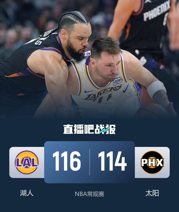 湖人(18-7):东契奇29分3板6助、詹姆斯26分3板4助2断2帽、艾顿20分13板2断、海斯12分9板2助、斯玛特8分4板6助2帽、范德比尔特7分7板2断、拉拉维亚6分8板1助2断2帽、文森特5分、八村塁3分7板1助2断。