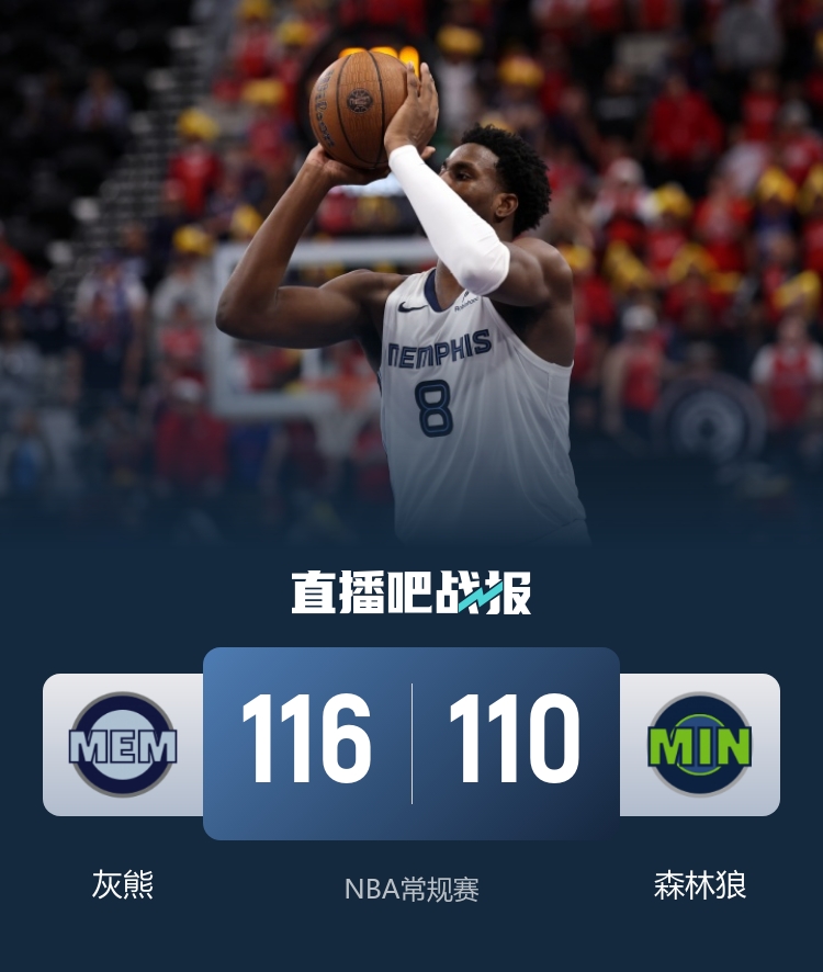 比赛开场,缺少主将的双方进攻端并没受到太大影响,韦尔斯和杰克逊担起灰熊队进攻重任,森林狼这边则是戈贝尔在禁区展现统治力,双方陷入拉锯战,首节结束灰熊29-27领先。次节回来,森林狼全队发力,连续在外线发炮,一度建立优势,杰克逊延续第一节的状态在禁区内连续得分帮助球队止血,半场结束森林狼62-61领先。易边再战,森林狼连续打成转换再次将分差拉开到9分,但随后灰熊打出一波14-0完成反超,随后双方交替进球,三节结束灰熊88-83领先。末节回来,兰德尔开始发力连续杀伤禁区,但灰熊总能给予回应,分差在5分上下浮动,比赛最后兰代尔连中两记底角三分,杰克逊抛射再进,灰熊领先到8分杀死比赛,最终灰熊116-110力克森林狼。